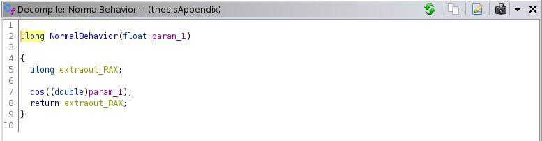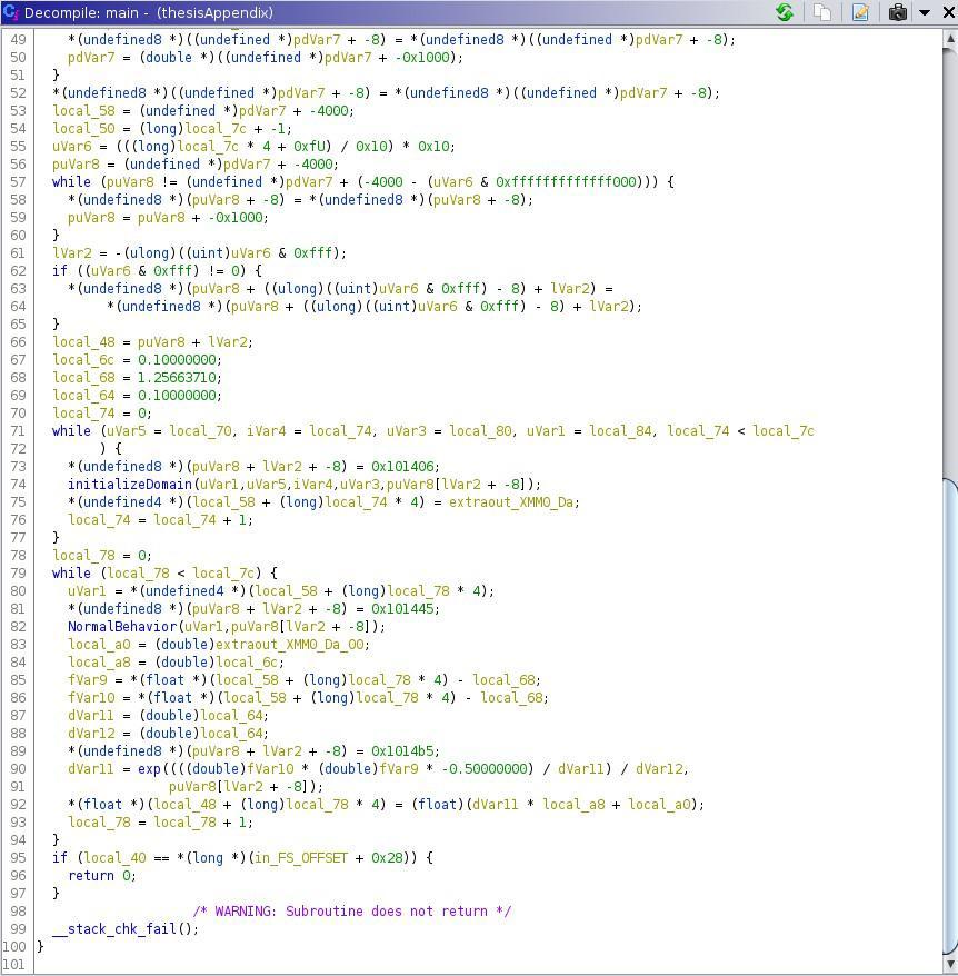 Interestingenough,whileinitialiseDomainiscalledwithfive parameters in main, the function signature only contains fourinputarguments.Anunsignedlongvariableisinitialised and returned unmodified by the function. The recompiled codeisapoorrepresentationoftheoriginalalgorithm.This isclearlynottheintendedfunctionalbehaviourofinitialise Domain, since the primary purpose of a function should neverbetoinitialiseanunusedvariableandreturnit.