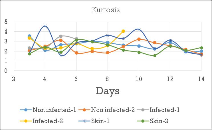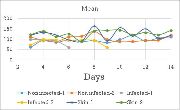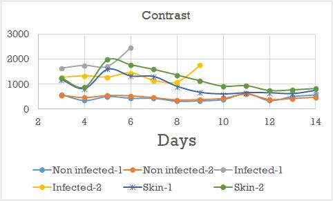 The features were extracted and analyzed in excel sheet. Features which gave better results were taken. i.e Contrast, Homogeneity, Mean and Kurtosis. Variations in the graphs were observed. And difference between the infected and non infected site is taken. These difference graphshelpinquantificationofthewound.Bythiswecan predicttheinfectionatanearlierstagei.ebeforevisibleto nakedeye.