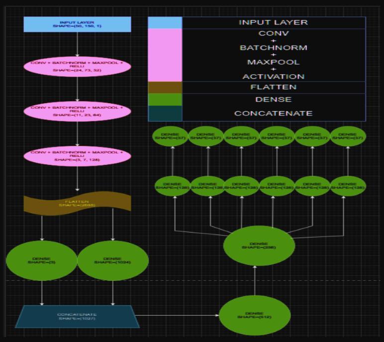 We intend to use fully connected convolutional neural networks for the task of CAPTCHA detection. The initial layersof the model consistof 3convolutional blocks, each consisting of a Conv2D layer with a different number of filters, BatchNormalization layer, MaxPooling2D layer and Activationlayer.ThisisfollowedbyaFlattenlayerwhichis connected to our regressor dense neuron with SoftMax activation.AsweintendtosolvemultipleletteredCAPTCHAs hence,wefirstproposetrainingaregressorthatcanidentify thenumberoflettersintheimage.Thenweusetheoutputof the regressor to detect the letters in the captcha by concatenatingtheregressor’soutputwiththeinitial dense layerofourmodel.Thefinaloutputlayersconsistof6dense layers, each with 37 neurons which corresponds to the number of unique characters. The following is the diagrammaticrepresentationofourmodel: