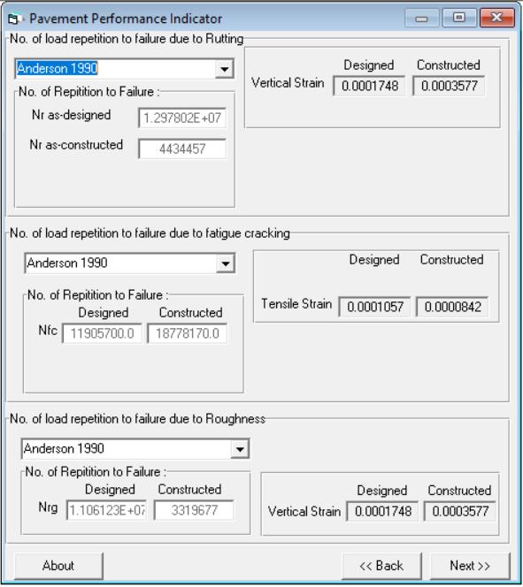The number of repetitions to failure (Nf) due to rutting, fatigue,and roughness is used asa performance indicator. Thereisapossibilitytochoosefrommanymodelstoget(Nf) suchasAnderson,1990.