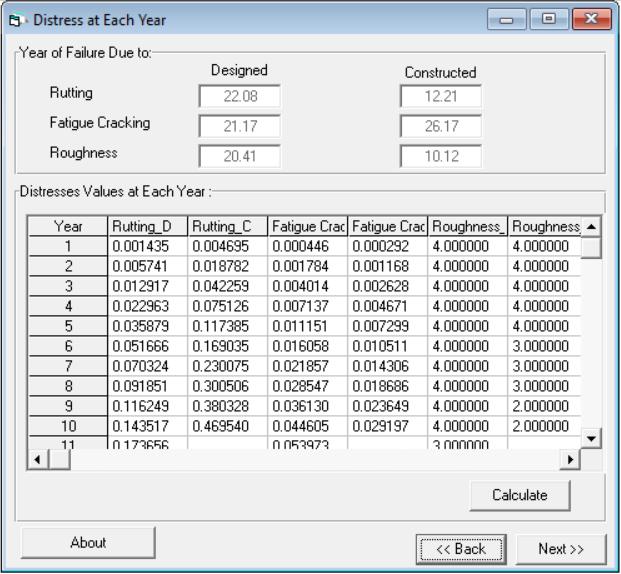11. The second form calculates the distress level at each year and the year of failure due to rutting, fatigue cracking, and roughness for both the as-designed and theas-constructedpavementsasshowninFig-12.