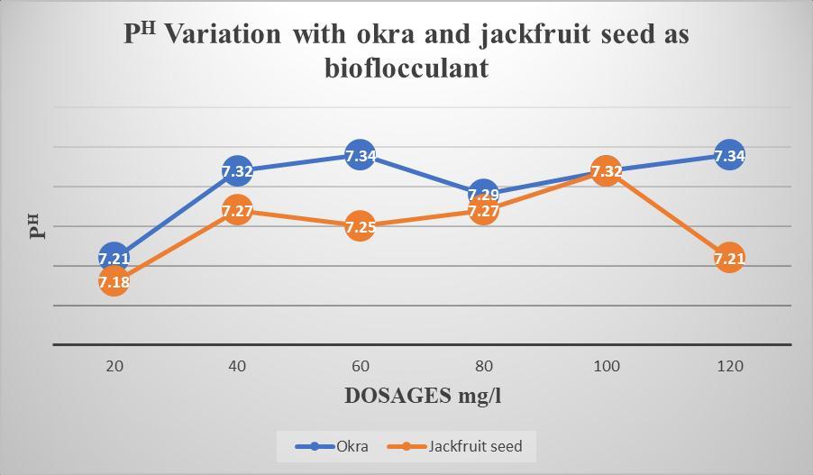 Performing out the jar test with different proportions of dosages of jackfruit seed powder and okra seed powder accordingtostandardjartestprocedureandthenfollowed byturbiditytestforsupernatantsfromeachjarofjartest. Optimumdosageofbothokraandjackfruitseedwasfound accordinglytotheleastturbidityvalue.Furtherexperiments wereoptimizedusingoptimumdosageasdosagefortreating otherparametersofsewagewastewater.Fromthejarand turbidityteststheoptimumdosageofjackfruitseedpowder wasfoundtobe80mg/landforokraitwasfoundtobe120 mg/l. Chart 1- PH Variation
