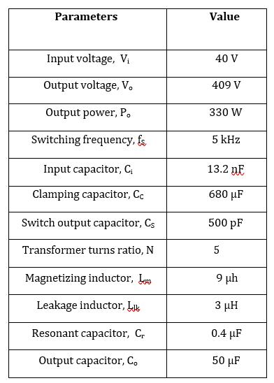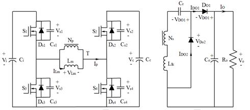 Metal-oxide semiconductor field-effect transistors are usedineachswitch.ExceptfortheiroutputcapacitorsCS1–CS4 and body diodes DS1– DS4, they are regarded as ideal switches. The input capacitor's name is Ci The clamping capacitor is Cc. The output capacitor is named Co ThevoltagesVi,Vc,andVo ofthecapacitorsCi,Cc andCo are each large enough to be regarded as constants. The transformer has a leaking inductor Llk and a magnetising inductorLm.Llk isthoughttobesomewhatsmallerthanLm Thetransformerhasaturnsratioof1:N,whereN=Ns/Np. TheresonantcapacitoriscalledCr