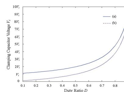 Fig. 2: shows the relationship between the clamping capacitor voltage Vc and the duty ratio D: (a) in the scenario of the traditional active-clamping circuit, and (b) inthescenarioofthedualactive-clampingcircuit.