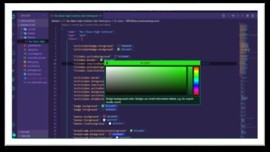 Creation of an extension requires knowledge of basic terminalcommands,scripting,AzureDevOps,hexadecimal colour codes and JSON files. Each element of the editor windowcanbecustomizedintermsofcolourinamainJSON file.TheVSCodecolourthemeextensionAPIdocumentation wasusedforreference[8].
