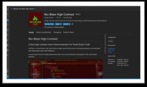 Abstract - This project named “Rev Blaze High Contrast”, is a high contrast colour theme extension for Visual Studio Code Integrated Development Environment (IDE) aimed at developers with a colour visiondeficiencycalledDeuteranopia. Constant inputs from the visually challenged were taken into account during the development of this theme. Development is done and tested on the same IDE. The extension is then made publicly available to download on the VS Code Marketplace. The steps to deploy the theme on the marketplace are also outlined in this paper. Results from the Analytics dashboard are also given in the paper to show the success of this extension.