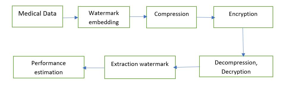 images require strict security measures. The medical information can often be shared to the professionals to improve treatment Huge amount medical data should be processed in hospitals for clinical and medical purpose of research. Malicious attacks on this medical data repots shouldbeavoidedandalsocancreatemedicalimageswith watermarks certification. Image quality is distorted in the spatialandtransformdomains.Theprocessofinsertingand extracting watermarking process. In the original image, a watermark(hiddenimageinformation)isinserted.IfImages areretrievedfromthedatabase,allowingphysicianstosee AuthenticationPhasewithExtractionwatermark.However, upon successful watermark extraction, created and the doctorcanproceedwiththediagnosistrust.Developmentof theDWT-HD-SVDAlgorithmBasedonthewatermarkused for this study A series of biomedical images are hidden under the cover image Embedding and retrieval of watermarks in data can be analyzed. This transformation includesfrequencyandLocationinformation,asopposedto theFouriertransform.Here,Signalenergyisconcentratedin specific wavelet coefficients with the discrete wavelet transform.Thispropertyisusefulwhenimagecompression is needed. lossless compression is used to Minimize data size. Encryption and decryption are Used the security. Proposal performance of medical data storage is also evaluatedbymultiplemetricssuchasmeansquarederror (MSE),peaksignalsignal-to-noiseratio(PSNR),root-meansquareerror(RMSE),andCompressionratio(CR).