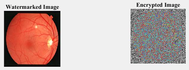 As illustrated in fig.5(d) the left image shows the watermarkedimageafterthewatermarkingphasetheimage issubjectedtocompressionandencryption.Theencrypted imagewillbelikeshownintheaboverightmostfigure.