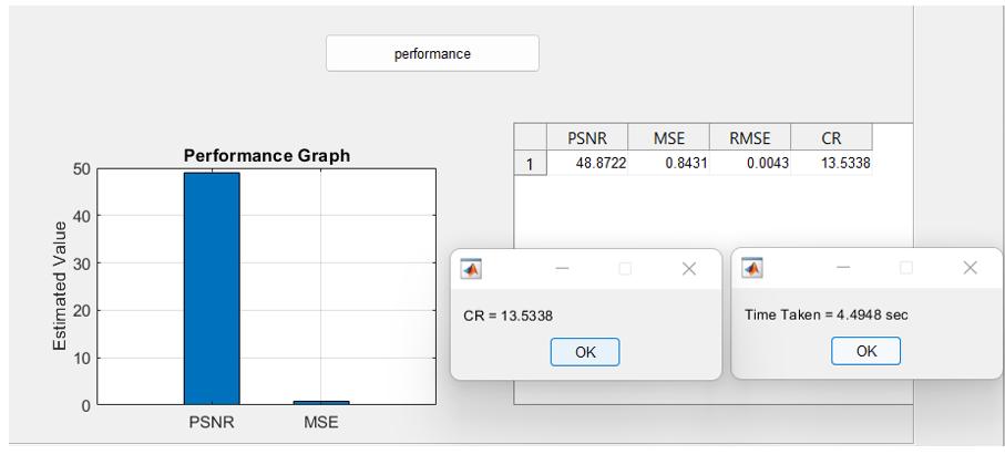 Thisfigureshowstheperformancemeasuresandgraph fortheBrainMRIdatabaseandthetimetakenfortheentire watermarking and de-watermarking is around 5 sec. The encryptedandcompressedimagesarestoredinaseparate folder.