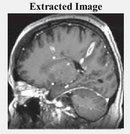 The decrypted image is generated by applying the decryptiontothecompressedimage,asshowninfig.5(e).The extractedwatermarkedimageispresentedontheright.By applying the De-watermarking, the Brain MRI image was retrievedfromthewatermarkedimage.