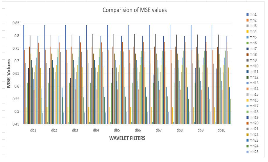 ThisMSEfigureshowstheresultfortheMSEvaluesofthe Brain MRI dataset for different orders of the Daubechies wavelet filters. The Mean Square Error (MSE) is used to determinethedegradationofimage.