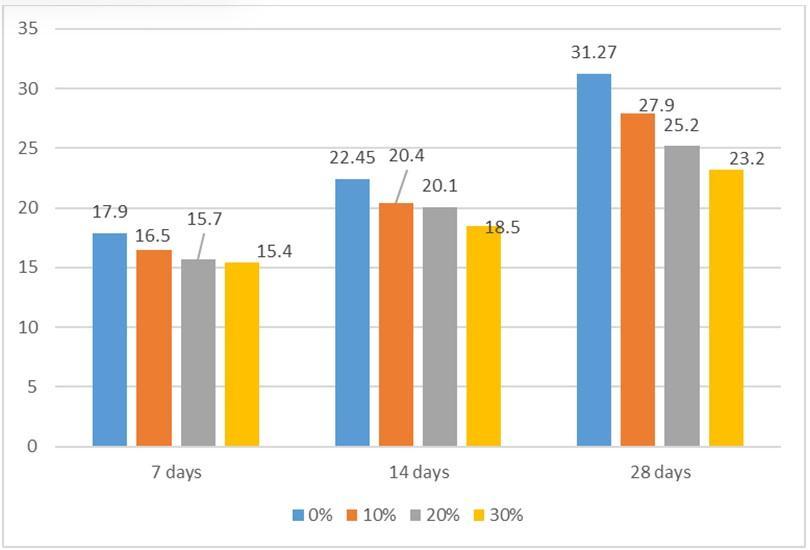Thestrategyespousedforthisstudyistoshakehandsand incorporate enough blenders ina11.42.40.5 wc ratefor a blendingrateof0.5.E-plasticphrasingsincludemeasuresof 0, 10, 20, and 30 percent by weight of the concrete in the blend.Theformwasaddedupanddulysmoothedprevious to blending for easy junking of the solid cement. Was. 3D places of size 15 cm x 15 cm x 15 cm, 15 cm X 30 cm cylindersareusedforthetestgovernance.Theassemblywas replaced motelywith an excavationoutfituntil the plastic positionwasreachedandretardationtestswereperformed to track the W/ C rate of the admixture and latterly to concentrateitintoaoiledcastironform.Thestrategywas espoused.Wentforwatertreatment.Sufficient3Dplacesof sizeweregiven24hourstosetbeforemaking.They'realso filledintoarelieftanktoplysufficient,advancehydration strength,dodownwithloss,andingestthehydrationraise until the age of the test. The 3D shape and cells were restored for days 7, 28, and 56. Concrete cylinders & cell wereladderedprevioustotesting,whiletheconsistenceof theconcretecellswasestimatedatdifferenttestingseasons. Before testing, the illustration was formerly again saved fromthetreatmenttank,whichwasleftoutdoorsforroughly 3hoursbeforebeingcrushed.Thecompressivestrengthof solidshapeswastriedoutasperMixDesign(IS102921982) usingaUniversalTestingMachine.