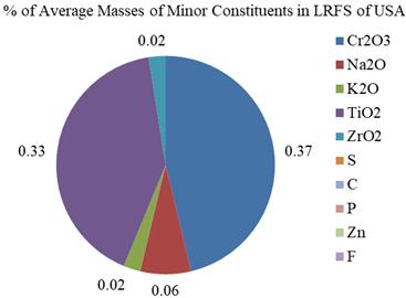 Based on the studies the ranges of Cr2O3, Na2O, K2O, TiO2,ZrO2,S,C,P,Cr,ZnandFandare0-1.59%,0-0.60%,00.36%, 0-0.60%, 0-0.20%, 0-1.50%, 0-0.64%, 0-0.25%, 00.25%,0-0.01%and0-1.66%respectively.