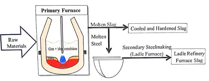 AnytypeofSSisamoltenby-productgeneratedduring theproductionofanytypeofsteel.Duringtheseparationof the molten steel from impurities in steelmaking furnaces, SS is acquired. SS can be categorized according to the furnaces used for its production. LFRS is a byproduct of steelmaking industries obtained from the LF refining of carbon and low alloy steels. The ladle furnaces (LF) have only been constructed in significant numbers since the 1980's[7].Ladleslaggenerationisapproximatelyonethird ofthetotalamountofslagusuallyproducedinanEAF[8].