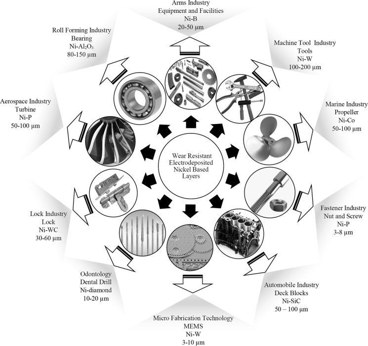 Numerous chemical, mechanical, and electrical processes require nickel and alloys including nickel phosphorous, nickel tungsten,nickelcobalt,andothers.Theimportanceofcompositecoatingswithsuperiorwearresistanceisrisingalongwiththe demandforlongerindustrialcomponentservicelives[25].TheapplicationsofnickelcompositecoatingsareshowninFig.1, whichrangefromthemaritimesectortothelockindustry.Theadditionoftheparticlesraisesthecoating'shardnessandwear resistancewhilealsoloweringitscoefficientoffriction.Amongotherengineeringcomponents,anickel-basedcoatingisapplied tocuttingtools,turbineblades,rollers,plungers,rollingmillrolls,extruders,pistonheads,androds[15].