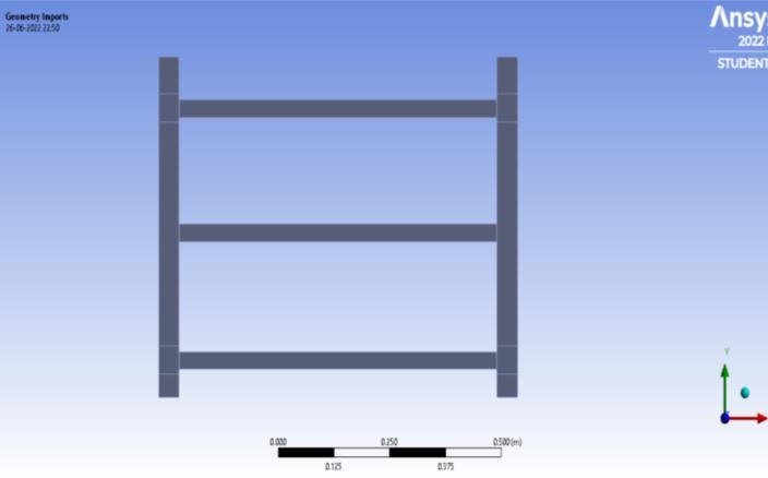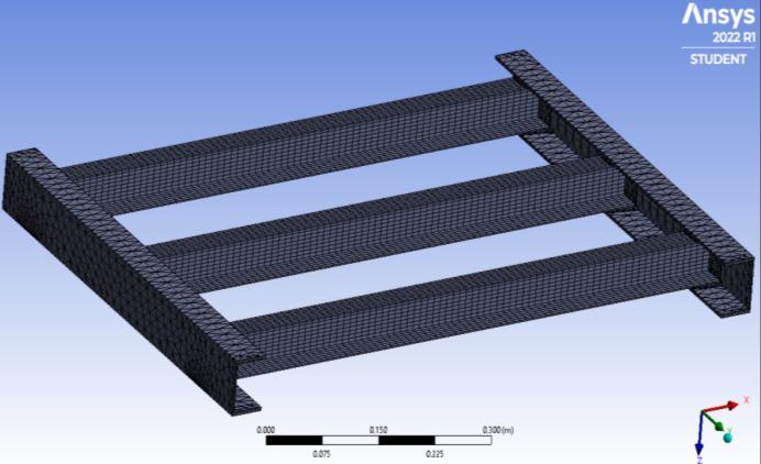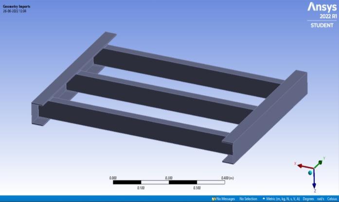 TheanalysisisdoneusingAnsysWorkbench2022R1.For themosteaseandsimplicityforanefficientanalysis,from variousreferencejournalsandpracticalinferences,thetotal loadconsiderationalongbyincludingafactorofsafetyof3 whichistheusualamountforfactorofsafetyconsideredfor steel, we came into the conclusion that 6000N is being appliedonthechassisframetotally.Fromrelevantjournals which focuses on the load cases acting upon the chassis framesshowsusthatthecross-membersofthestructures are the weakest part of the chassis were most amount of deformationduetotheapplicationsofloadoccurs.Alsofrom engineeringtheories,weknowthatifthecriticalpointonthe structure withstands the total amount of load, then it is definitethattheentirestructureasawholealsowithstands theload.Criticalpointisdefinedasthevirtualpointonany structurewhere when a loadisappliedisconcentrated at maximumdeformationisfound.Forourchassisframe,due totheabove-mentionedhighlightswecanassumethatthe criticalpointsisinthemiddlespanofthecross-members.