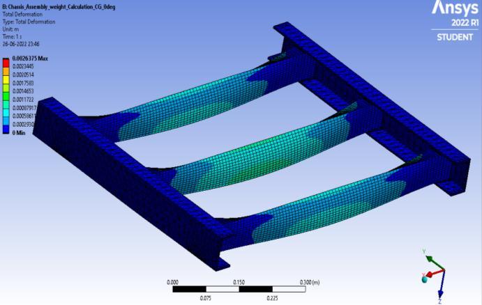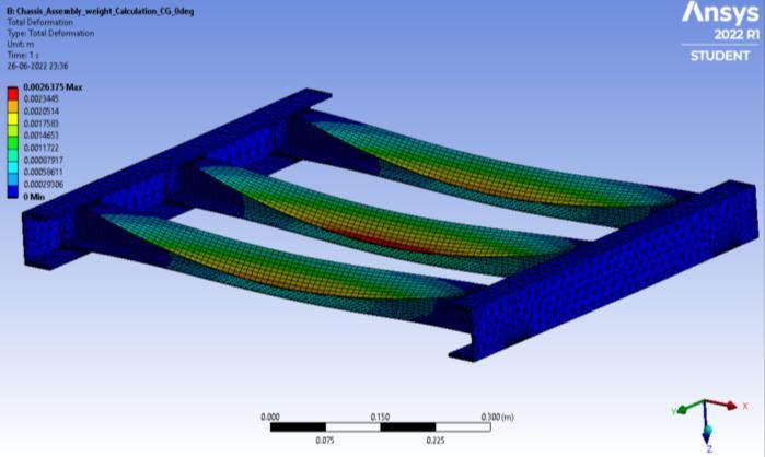 Fromtheimagewecanseethatthemaximumdeformation happening here is 0.0026375m which is visible to be happeningatthepreviouslyassumedcriticalpointregionon thecross-member.