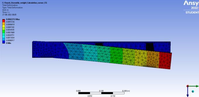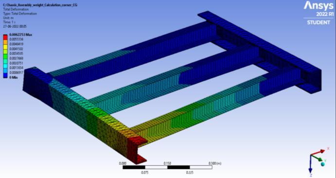 From the analysis, we can see that the total magnitude of deformation occurred is 0.0030191m which also located nearthecriticalpointregionofthecross-memberasstudied earlier.