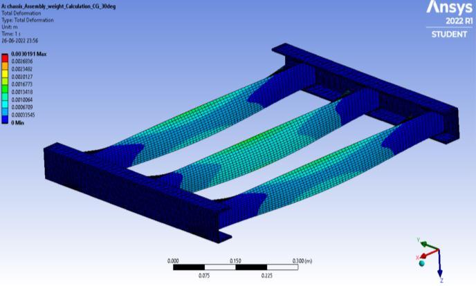 For both the 0 degree and 30-degree inclined load applicationitisobservedthatthemaximumdeformationis happening at the maximum allowable limit on the application of 6000N. The load of 6000N was considered includingafactorofsafetyof3forsteelasusual,whichalso makes it evident that practically this load is safe for the chassistowithstand.