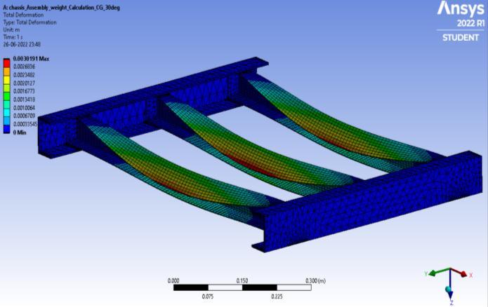 On considering the practical application where the harvestingmachinerytakingitspathofmotionalonga30degree inclined terrain, the static load due to the gravitational force would act in a way that it is acting inclined as much with respect to the inclination of the terrain. For that case study, we have inclined the load appliedatanangleof30degreeswithrespecttothevertical axis(yaxis)ofthecoordinatesystememployedforanalysis. Thedeformationforsuchacaseisthusobtained.