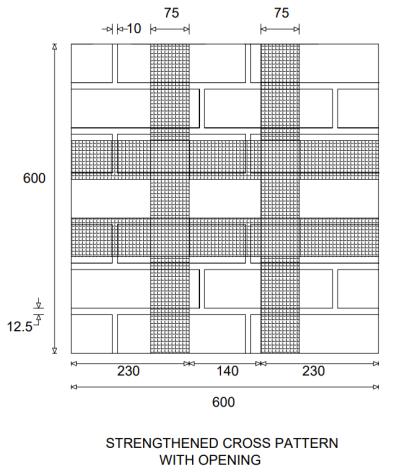 wereanalysed.Thein-planeandout-of-planeperformance ofthewalletteswithopeningstrengthenedusinggeotextile was studied. The wallettes were strengthened using two different patterns that is vertical and cross. Also, the strengtheningwasdoneonbothsidesofthewallettes.