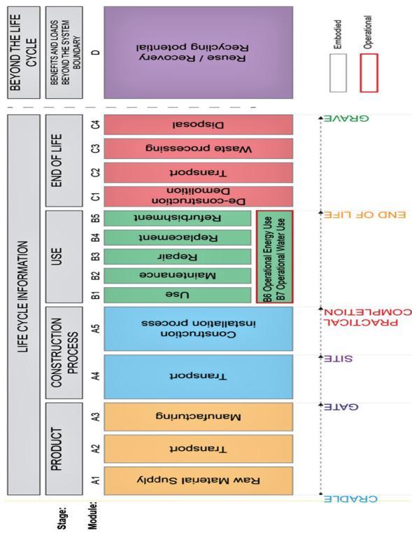 Embodiedcarbonistheresultofallthetasksinvolvedinthe constructionanddeconstructionofabuilding.Itisthetotal lifecyclecarbonfootprintminustheoperationalcarbonfoot print According to the IGT report, CO2 emissions occur throughout the life cycle of a building, from preliminary concepttorepairandmaintenanceoreventualdemolition These emission levels can be quantitated in order to calculate a building's carbon life cycle footprint, that can thenbeusedtodesignanefficientreductionstrategy[11]. AccordingtoInnovationandGrowthTeam(IGT),thestages of a building project's carbon life cycle emissions are as follows: