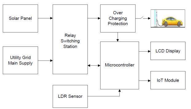 Oneofthemainsourcesofcarbondioxideemissionsand air pollution is because of the vehicles. The increase in widespread use of electric vehicles (EVs) is a potential way to tackle environmental issues and reduce carbon emissions in the transportation industry. In the project designed, we have developed a charging station for electric vehicle. We are able to successfully able to test hardware.Itisworkingasperexpectedworking.Weare abletoswitchsourceautomaticallyasshowninFigure7 AsweknowSolarelectricityisalsoexpensiveand many times variable, conventional methods of charging that ensure100%rechargeare not still possible.In the most cases full available power from the PV array will be transferred to the battery till the voltage level increases toacertainlevel,andindicating fullchargeisachieved.