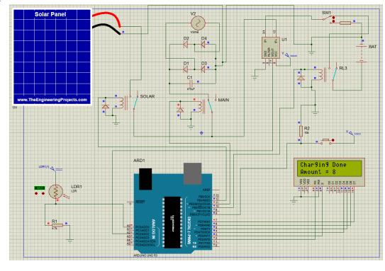 ForthisprojectsimulationtheProteus8Professional software tool is used to draw schematics, PCB layout, codeandevensimulatetheschematic.Designing,testing and debug is completely embedded inside schematic capture before making a hardware prototype. A complete workflow for designing an Arduino appliances andthencontrollingitremotelyfroma mobilephoneor browser. It was developed by Labcenter Electronic Ltd. The ATmega328P microprocessor, LDR sensors, bridge rectifier, pull down resistor, current sensor, LCD, and activeswitchwereallutilisedwiththeArduinoUno.
