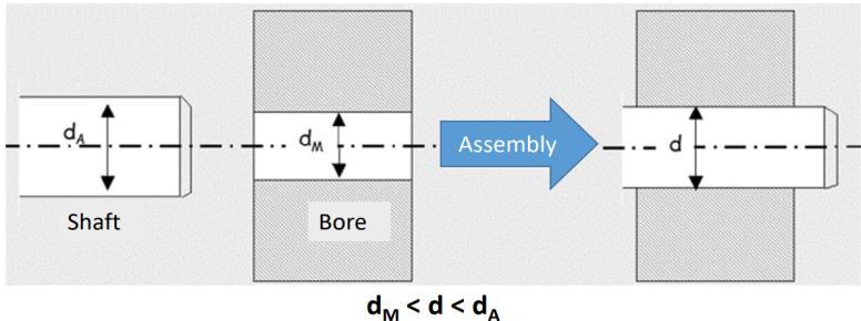 Figureshowsthedimensionsofrotorandshaftinterferencefitpriortoassembling.Interferencefitisalsoknownaspressfitor frictionfit,isafasteningmethodwheretwoparts,typicallycircularcrosssectionshape,arepushedtogether(oneintothe other)andkeptinplaceduetothepressurebetweenthem.Typically,theinnerpartwillhaveanominalouterdiameterslightly greaterthanthenominalinnerdiameteroftheouterpart,andwhenpushedorforcedtogetherthecontactfrictionforceskeep thepartsfrommovingrelativetoeachother Thelevelofinterferencedependsonthenegativedifferenceinnominaldiameters.