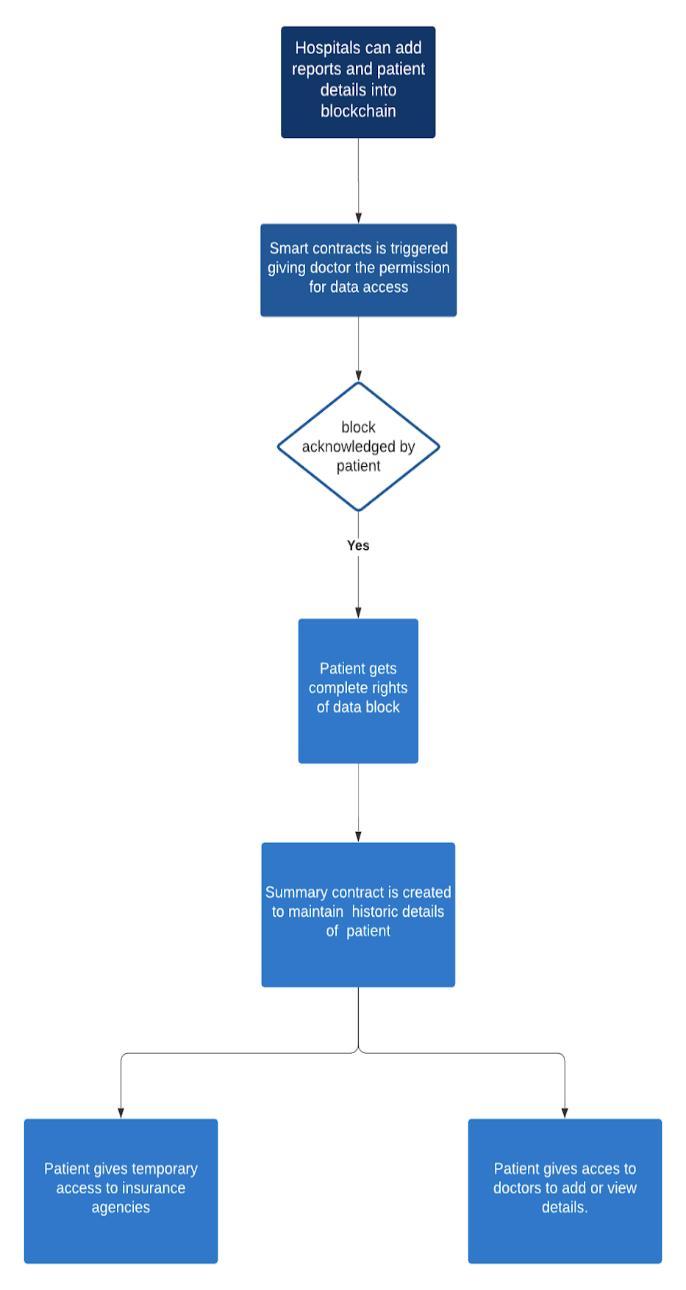We implement a system wherein a patient would havethecontroltograntandrevoketheaccessrightsof his medical records but he won’t have the rights to create a new record. This functionality is desirable as a doctor is more accountable and this would ensure that the data generated into the system is authentic and credible.Thisdatawillberecordedinasmartcontracts. Since for a patient, the records can originate from different sources we need to keep a track of all such contracts related to a patient. This will be our summary contractwhichmapapatienttoallit’srelatedrecords.