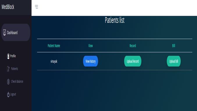 After registration, a doctor can see list of patientsthathehasaccesstoandthenproceedonto uploadanydocumentsrelatedtothatpatient.These documentsarestoredinIpfs,whichisapeer-to-peer network, and the hash address generated is stored intoblockchaintoreducetheamountofgasusedfor thetransaction