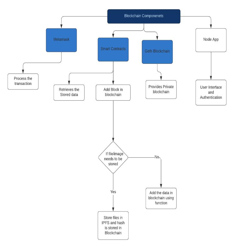 IPFS : Since our system demands storing of large files and data which can be in image and other format, We use Interplanetary File System(IPFS) which stores large files in a decentralized network and generates the hash of the stored address which is used for retrieving of the files and storing of the addressinblockchainnetwork.