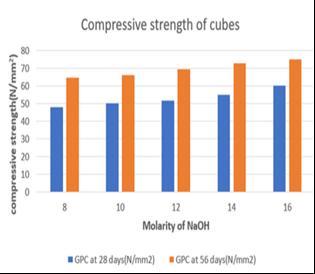 The ratio of sodium silicate to sodium hydroxide taken in this study is 2.5.The compressive strength of geopolymer concrete is directly proportional to molarity of sodium hydroxidesolution.Fig3explainthathighmolaritysodium hydroxideshowhighercompressivestrengthat28and56 day[2].