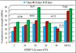 Bouaissi. et.al [16] State that large amount of GGBS impact negatively on strength development. Compressive strengthofflyash-GGBSbasedgeopolymerpasteincreases inthebeginningandcompressivestrengthdecreaseswith large amount of GGBS replacement. Replacement of GGBS become40%,thecompressivestrengthreducedwithtime.