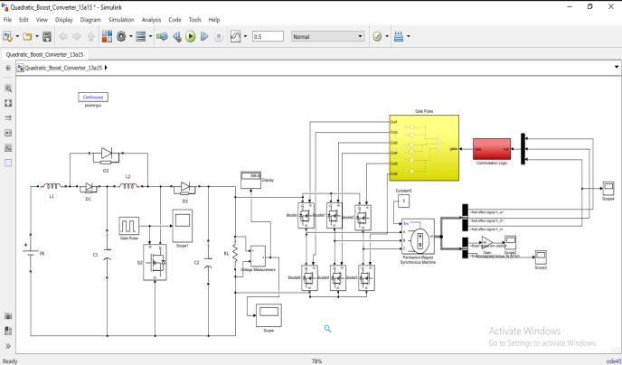 Thesystem'simplementationblockdiagramshowsaBLDCmotor,aVSIinverter,aDCtoDCconverter,andacontroller, orBLDCmotorcontroller,tomanagethemotor'sbehaviourandfunctioning.TheQBCisshowninpreviouspictureasaDC supplyconverterthatreplacesthenormalconverterwitha QBC.Switches,inputRippleandoutputrippleareallreduced inthecircuitbyusingaQBC.TheoutputoftheQBC isthensenttotheinverter,whichgeneratesaconstantoutputtorque bysequentiallyswitching themotor'sstator windings, resulting in a constantoutputpower. The motor controller usesa hall effect sensor to determine the speed and location of the motor. The whole simulation diagram of a solar power suppliedBLDCisshowninthefollowingimage.AspecificloadapplicationwasdrivenbyaBLDCmotorinthesimulation model.