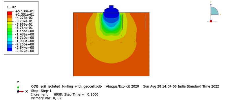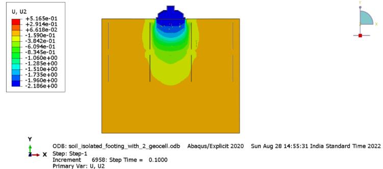Settlement result of two-layer geocell reinforced isolated footing is shown in fig 14. The analysis results concluded that, there shows an ultimate maximum settlement of 2.186mmandminimumsoftupliftof-0.516mmisnoted.