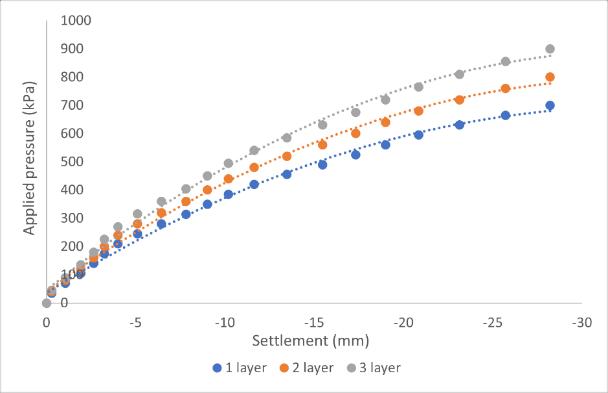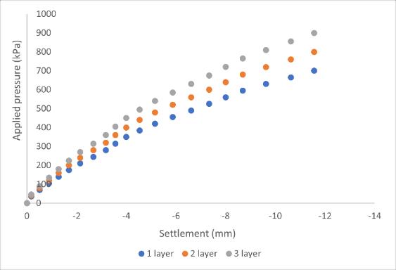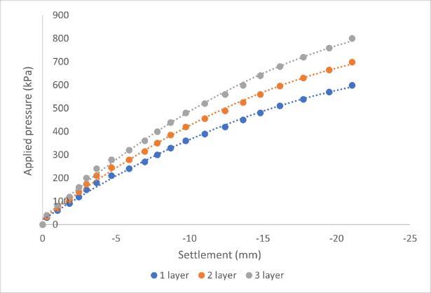 Oncomparingtheresultsofone-layer,two-layerandthree later geocell reinforced strip footing, three-layer geocell reinforcedstripfootingoffersbettersettlementreduction. Thus, by reducing the settlement, the bearing capacity of thesoilisincreased.