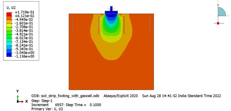 The settlement result concluded that, there shows an ultimate minimum settlement of 2.09mm and minimum soil uplift of -0.257mm. thus, when soil settlement is reducing on increasing number of layers, the bearing capacitycanbeincreased.