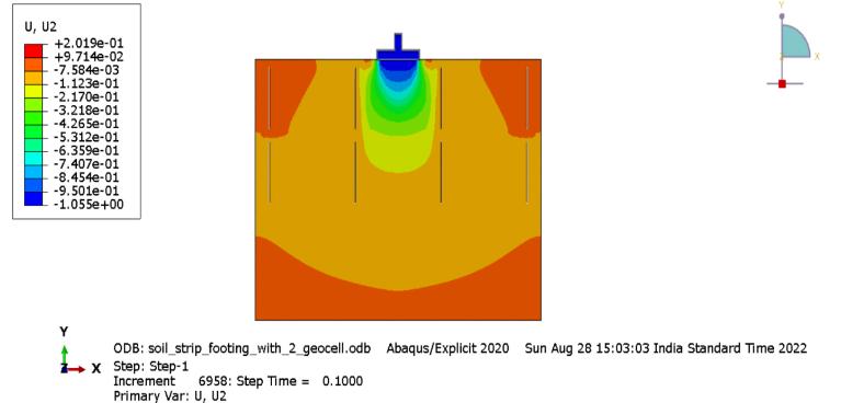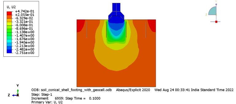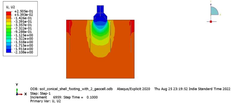 The analysis result shows that the two-layer geocell reinforcedconicalshellfootingonappliedpressureshows an ultimate maximum settlement of 2.108mm and an upwardsoilliftof-0.250mm.thisshowsthatonincreasing the number of layers of geocell, the settlement of the footingreducedtoanoticeablelimit.