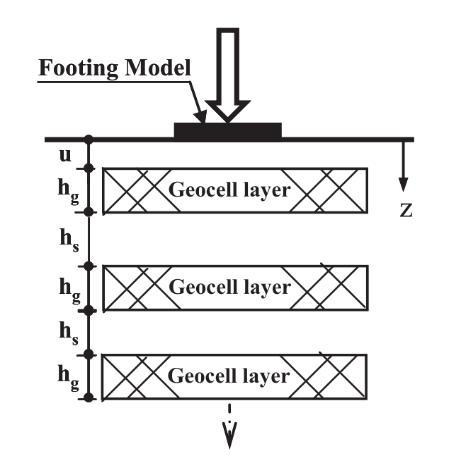Where u is the height of the soil from the footing base to thetopofthegeocell,hg istheheightofthegeocellandhs is the height of the soil layer between the geocells. Multilayers of geocells helps in reducing the stress developed inside the soil to a great extent. Therefore, the settlementorthedeformationtherebyreduces.