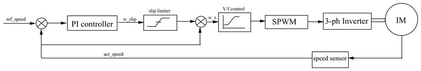 The error signal one which results from this compared is thenfedtothePIcontroller,whichprovidestheangularslip speed,whichisthencomparedtotheactualspeedagainwith theslipregulatortokeepthespeedwithinallowablelevels. Atlast,theerrorsignalisfedtotheV/Fcontrolblock,which isfedtotheSPWM,andandatlasttotheinverter,