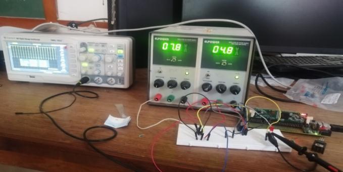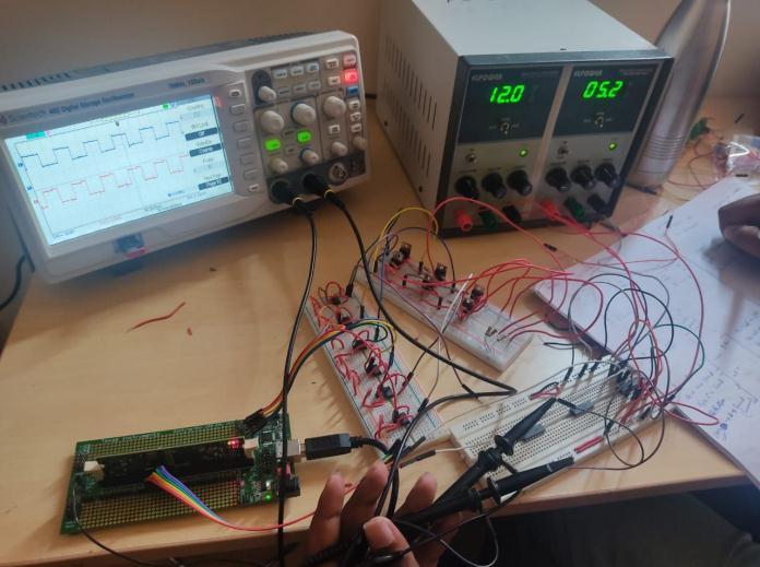 With the help of DSP-C2000 interface and IR-2113 driver circuit,wecangenerateswitchingpulsesof20kHzforIGBT (asshowninFigure14)(Alsocompletehardwaresetupof AFEDisshowninFigure13).