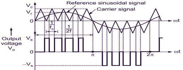 Abasicsourcevoltageinverter'sswitchescanbeswitched onandoffasrequired.Theswitchisactivatedordeactivated once for each cycle. Accordingly, a square waveform is formed (as shown in Figure 3). However, if the switch is periodically turned on, an improved waveform with a harmonic profile is produced. The sinusoidal PWM waveform is created by matching the desired modulated waveformwithatriangularwaveformwithahighfrequency. Depending on whether the voltage of the signal is less or morethanthatofthecarrierwaveform,theoutputvoltageof theDCbuswilleitherbenegativeorpositive.