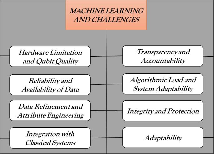 Despiteitsvastpotential,QMLhasamultitudeofobstacles that must be overcome. These include inadequate hardware, inadequately developed algorithms, complex data the absence of advanced software frameworks in quantum systems, and a disproportionate demand for processing power [40]. These inadequacies severely constrain the quantum ML models and the accessible computation capabilities make the execution of more sophisticated models a daunting task. Perhaps the most critical of these, however, is the issue of data encoding in which conventional data is encoded into quantum states before processing on a quantum system [30]. With the growing count of qubits, the ability to hold the quantum state, as well as manage the error rates, becomes more challenging. Designing quantum algorithms that outperform traditional ones in efficiency is still an unsolvedproblem.Manyofthesealgorithmsarestillinthe foundational stages of development, or are purely hypothetical. The added complexity of these problems is theinteractionofclassicalandquantumcomputingthatis solved by the use of hybrid algorithms combining both computational types [18]. The development of