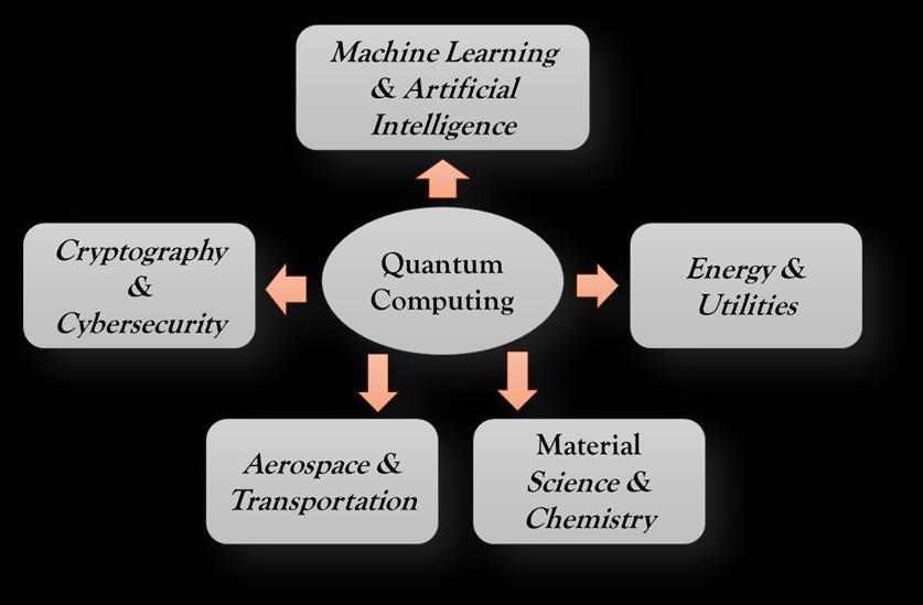 Figure 1: This figure show the applications of quantum computing QC in multiple areas, which are Machine Learning,CryptographyandCybersecurity,AI,Energyand Utilities, Aerospace and Transport, and Finance and Risk Analysis. With QC, the speed and efficiency of problemsolvingincreasesandthecomputingcapabilitiesimproves.