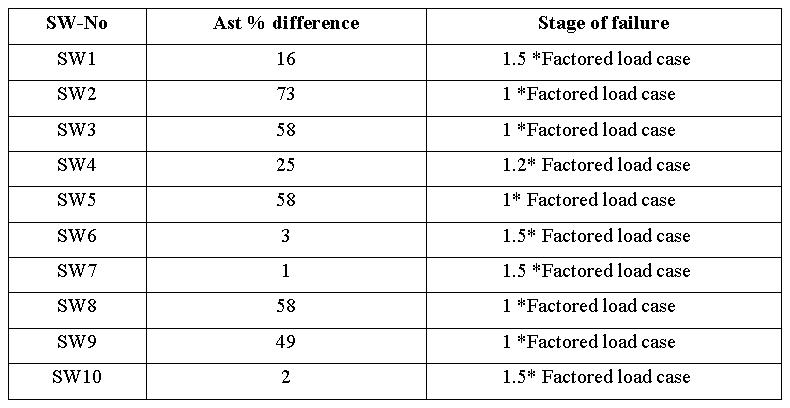If Ast difference > 25%, failure in the Shear wall would occur at 1.2 factored load case or in some cases,failure wouldoccur asearlyas1.0 factored load.