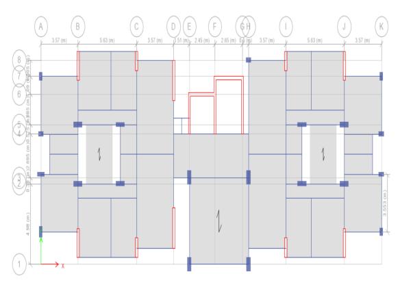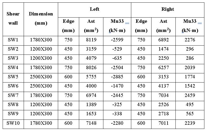 Insteadofapplyinguniformreinforcementacrossallshear walls,thedesignwascarriedoutusingtheSimplifiedCenter andTorsion(C&T)methodavailableinETABS.Thismethod automatically assigns varying longitudinal reinforcement (Ast)valuestoeachboundaryelementbasedonthewall's position,loadingdemand,andmomentprofile.Asa result, eachshearwallinthebuildingreceiveddifferentAstvalues on its two ends, reflecting a realistic design approach. A summarytablelistingtheAstvaluesforeachshearwalland theircorrespondingboundaryzonesisattachedbelow.