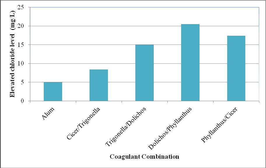 Monitoring chloride concentrations after treatment is crucial,aselevatedlevelscanleadtocorrosivityinpipelines, poor taste, and potential non-compliance with drinking water standards. The World Health Organization (WHO) prescribesamaximumallowablechlorideconcentrationof 250 mg/L in potable water [1]. Accordingly, this study analysed the chloride levels in water treated with both binary bio-coagulantsandalumtodeterminewhetherthe coagulantsintroducedadditionalsalinity.