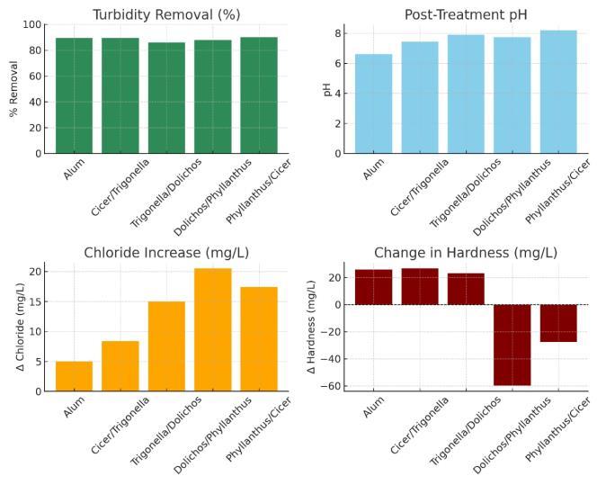 Thissectionpresentsthecomparativeperformanceofbinary bio-coagulant combinations and conventional alum in treatingsyntheticturbidwater.Theparametersevaluated include turbidity removal efficiency, post-treatment pH, changesinchlorideconcentration,andtotalhardness.Each