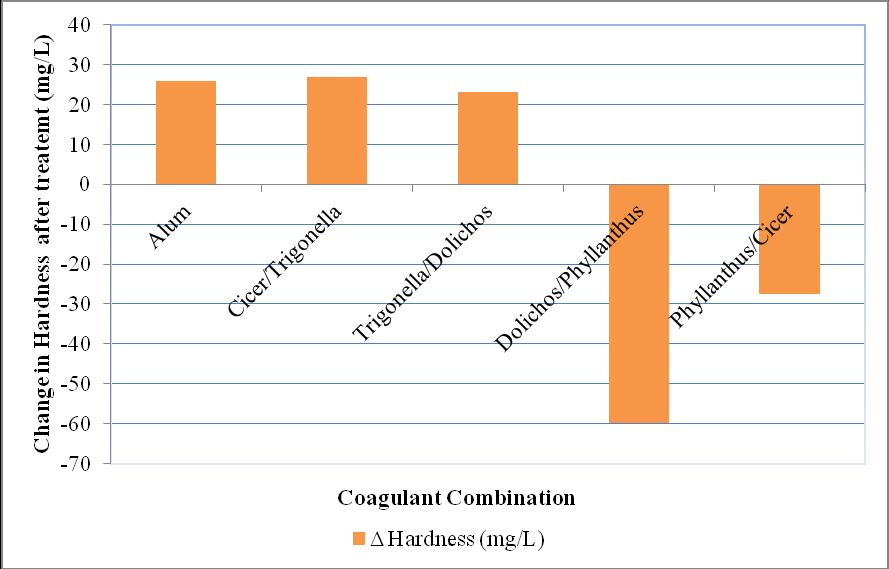 AsshowninFigure4,thebinaryblendof Dolichos lablab/ Phyllanthus emblica achieved the highest total hardness reduction, with a decrease of 59.8 mg/L. The Phyllanthus emblica / Cicer arietinum combination followed with a reductionof27.5mg/L.Bycontrast,alum-treatedsamples exhibited negligible hardness removal, and in some cases, evenaslightincrease likelyduetoionicexchangesorthe presenceofresidualaluminiumcompounds.